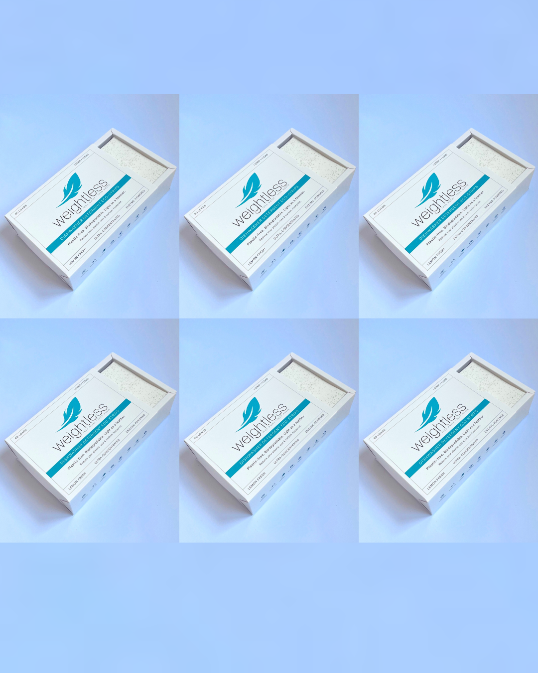 No single-use plastic container. Perhaps even more important is our liquidless detergent sheets also have a lower carbon footprint than heavy liquids, pods and powders. You see, the heavier something is, the more fuel gets burned shipping it. Weightless Dishwasher Sheets are 32x lighter than liquid detergents & pods, helping to lower your home’s carbon footprint. See how we got our name: Weightless.