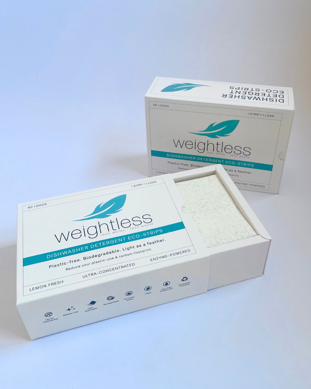Weightless Dishwasher Detergent Sheets pack enzyme-powered cleaning into a small, pre-measured strip of dishwasher detergent. They're plastic-free, biodegradable, light as a feather, and they save so much space. These liquidless sheets are tough on grease and grime, while gentle on the earth.